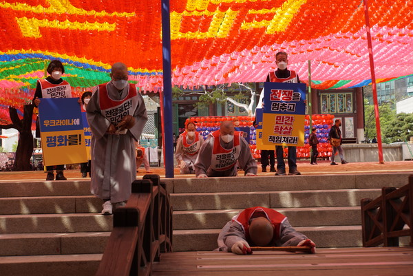 우크라이나를 침공한 러시아군의 민간인 상대 범죄 소식이 연일 이어지고 있는 가운데 스님들이 우크라이나의 평화를 기원하며 온몸을 던졌다.