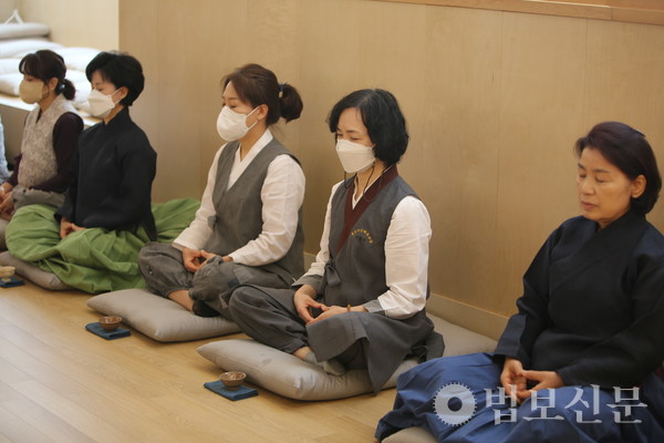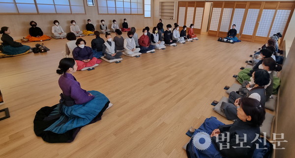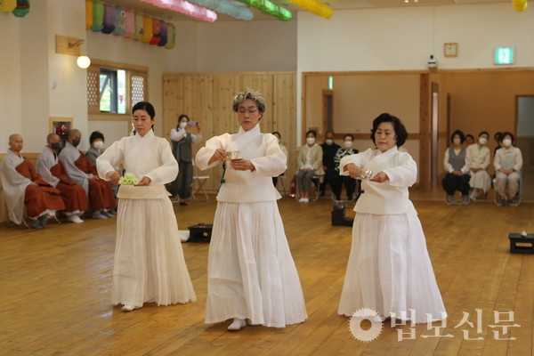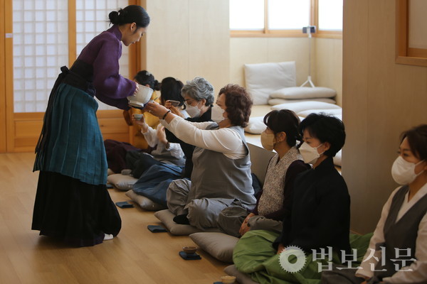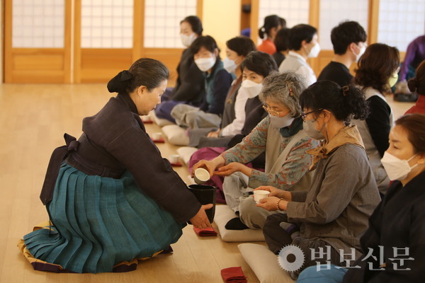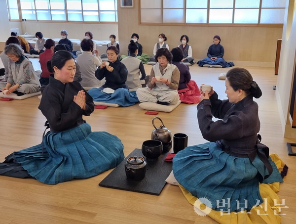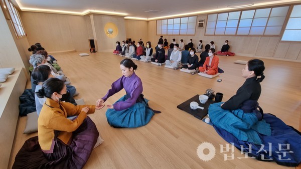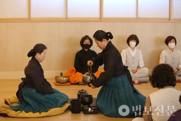 이날 차행법숙우회는 대웅보전에서 ‘천처(淺處)’ 다법으로 차와 향, 꽃을 불전에 공양했다. 이어 선차실에서는 간결한 흐름 속에서 여러 사람이 함께 차를 마시고 명상에 드는 선차 다법 ‘청풍(淸風)’을 선보였다. 특히 차명상 중 좌선 시간에는 바라밀선원 주지 인해 스님이 직접 누구나 쉽게 할 수 있는 명상의 방법을 안내하며 차를 통한 명상의 가치를 소개했다.