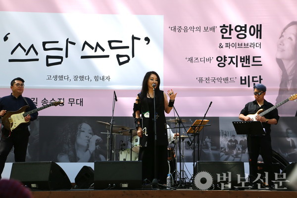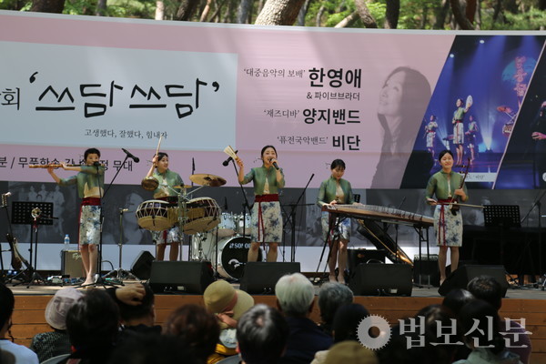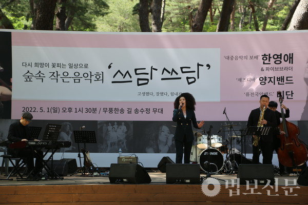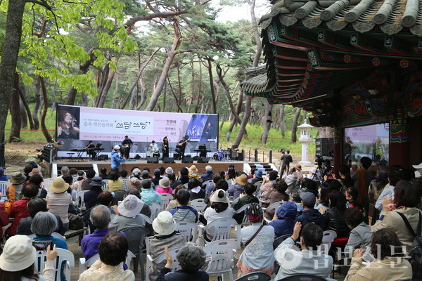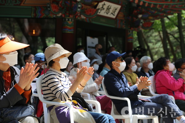 통도사(주지 현문 스님)는 5월1일 경내 무풍한송로 송수정 앞 무대에서 ‘통도사 숲속 작은 음악회 – 쓰담쓰담’을 개최했다. 공연이 진행될 송수정 앞 무대는 통도사의 도보 진입로인 무풍한송로 내 위치해 자연과 음악이 어우러지는 야외 공연의 명소로 각광을 받아온 곳이다. 특히 ‘코로나19 극복’을 넘어 ‘일상회복 발원’이라는 취지를 담아 그동안 중단됐던 ‘숲속 작은 음악회’의 재개를 알리는 공연으로 진행된 가운데 공연 시작 전 일찌감치 객석으로 마련된 좌석이 꽉 찼으며 많은 시민과 불자들이 서서 공연을 관람하는 등 호응을 얻었다.