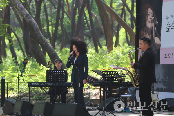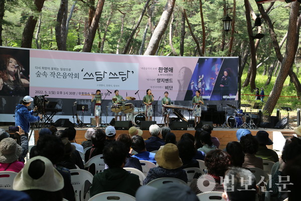특히 이번 음악회는 출연진도 화려했다. 한국 대중음악을 대표하는 독보적 음색의 보컬리스트 한영애 씨가 특유의 음색으로 노래를 선사하며 숲속 무대의 가치를 높였다. 또 ‘싱어게인2’에 출연하며 존재감을 드러낸 재즈 보컬리스트 양지를 주축으로 구성된 ‘양지밴드’, 뛰어난 음악성의 창작곡과 대중에게 잘 알려진 곡을 본인들의 색다른 스타일로 재해석하는 퓨전 국악그룹 ‘비단’의 무대가 전개됐다. 국악, 재즈, 대중가요 등 무대마다 개성 가득한 연주의 향연은 숲속 작은 음악회가 지닌 소나무 숲과 어우러진 생생한 공연으로 감동을 더했다.