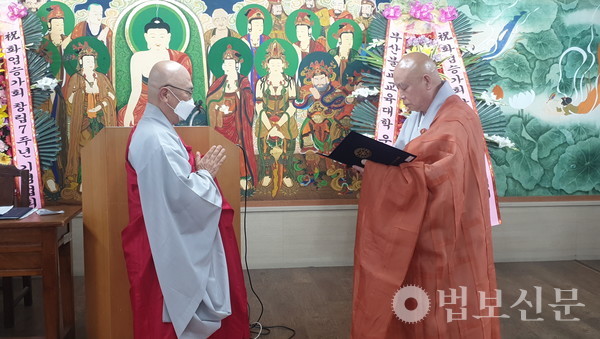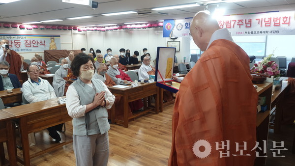화엄승가회(회장 자인 스님)는 5월28일 부산불교교육대학 대강당에서 ‘창립 7주년 기념법회’를 봉행했다. 이 자리에는 화엄승가회장 자인 스님을 비롯한 회원 스님들과 부산불교교육대학장 범혜 스님, 현익채 전 금정중 교장, 장상목 부산교수불자연합회장, 장남주 한국대학생불교연합회 부산지부장 등이 동참했다. 법회는 삼귀의 및 반야심경, 발원문, 내빈소개, 경과보고, 임명장 수여, 회원증 수여, 감사패 수여, 모범 신행상 수여, 모교발전장학금 전달, 대학교 불교동아리 지원금 전달, 장애인 포교단체 후원금 전달, 인사, 격려사, 축사, 동아리 대표 인사 등으로 전개됐다.