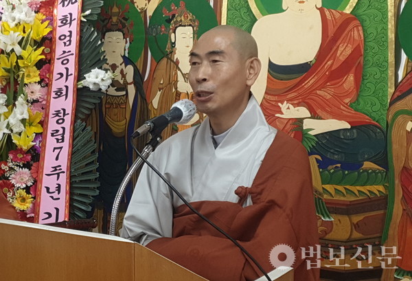 화엄승가회장 자인 스님은 인사말에서 “우리들의 선한 공덕으로 세상은 조금씩 더 맑고 향기로우며 살맛이 나는 세상, 불국토로 변화함을 믿는다”며 “7주년을 맞아 안으로는 자신의 허물을 뒤돌아보고 참된 삶을 서원하고 실천하며 부처님의 가르침을 꽃피우는 승가단체로 더욱 적극적인 활동을 펼칠 것”이라고 발원했다. 이어 스님은 “이 자리에서 함께해주신 각 대학 불교 동아리 대표 학생 여러분과 지도자 모든 분께 감사드린다”며 “대학생 여러분이 바로 불교의 미래며 우리 사회에 맑은 법향을 전하는 연꽃이 되어주길 바란다”고 격려했다.