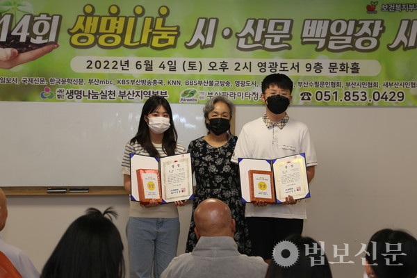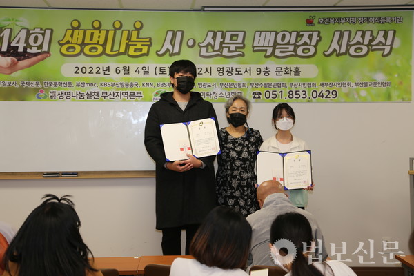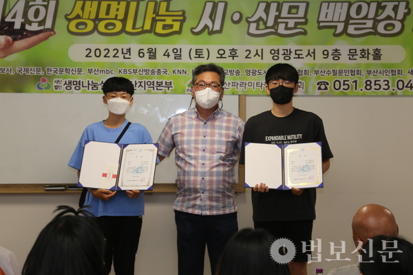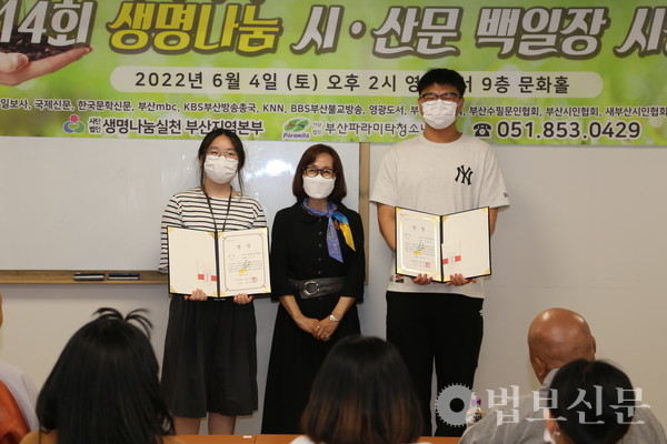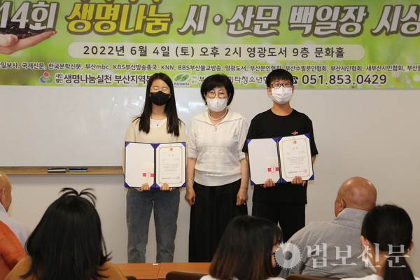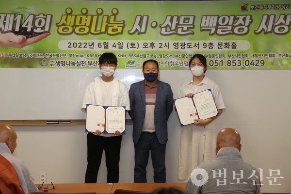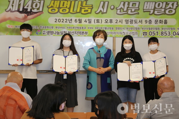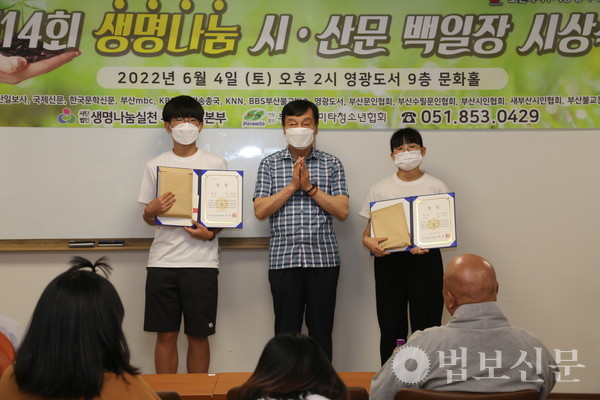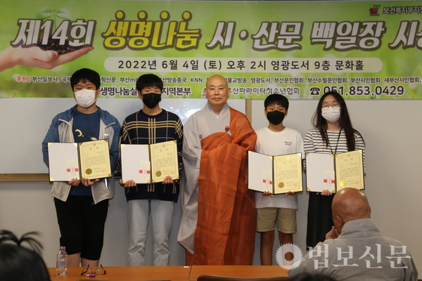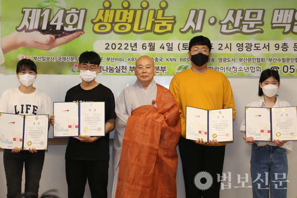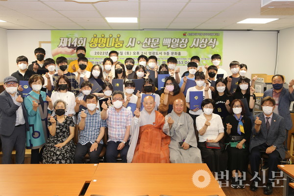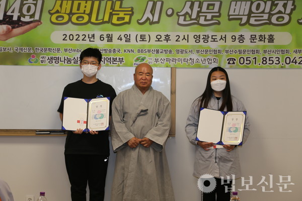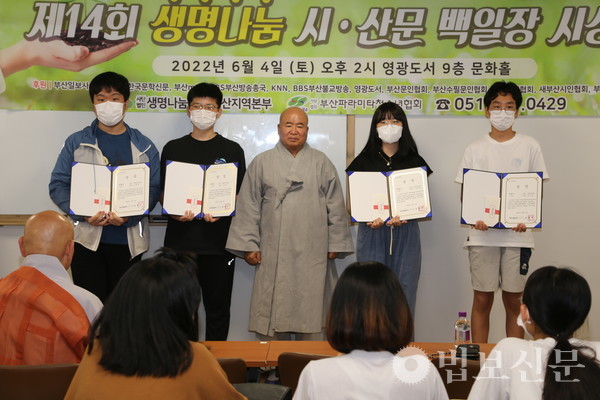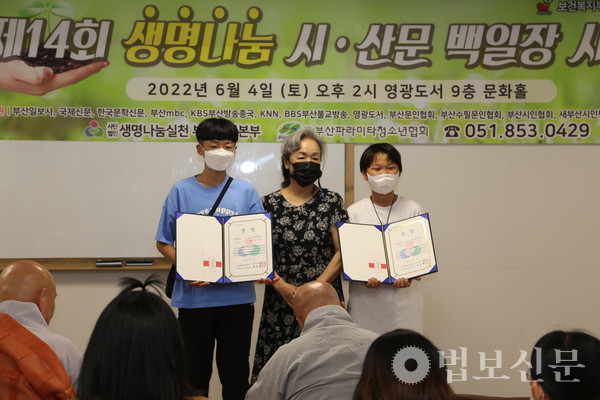 생명나눔실천 부산지역본부(본부장 심산 스님)는 6월4일 부산 영광도서 9층 문화홀에서 ‘제14회 생명나눔 시ᐧ산문 백일장 시상식’을 개최했다. 부산파라미타청소년협회(회장 백명숙)와 공동주최로 마련된 이번 백일장은 지난 5월28일 시상식과 같은 장소에서 부산지역 중·고등학교 청소년 100여 명의 동참으로 진행됐다. 심사를 거쳐 대상인 부산시장상은 운문부 김문성(해동고), 최연미(대천리중), 산문부 하승민(해동고), 이휘소(대천중) 학생이 각각 수상자로 선정됐다. 시상식에서는 대상을 비롯해 총 40명이 수상자로 선정됐다.