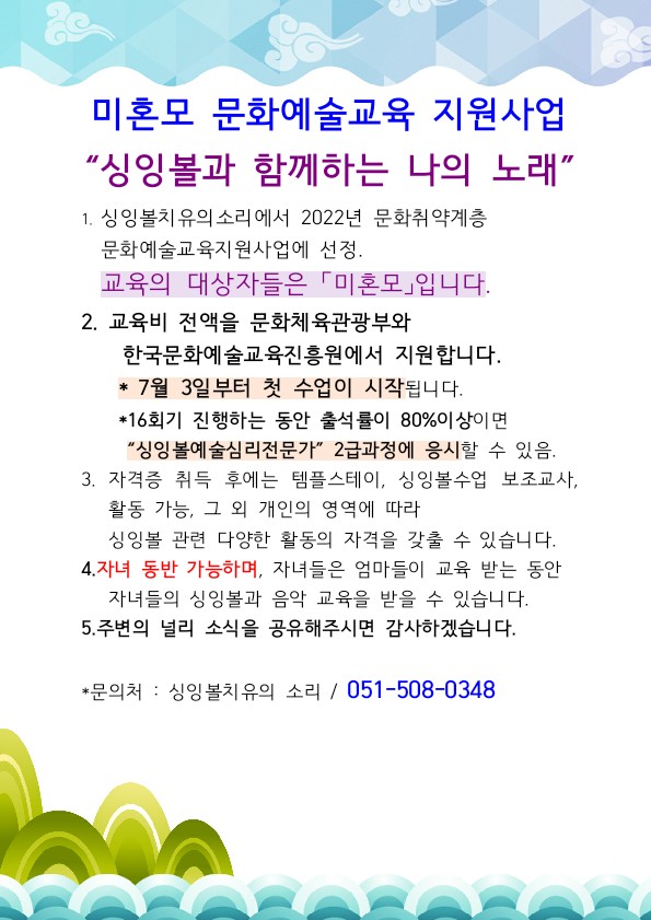 사단법인 싱잉볼치유의소리(이사장 심산 스님)는 7월3일부터 매주 일요일마다 총 16회에 걸쳐 부산 홍법사 내 한나래평생교육원 강의실에서 ‘미혼모 문화예술교육 지원사업-싱잉볼과 함께하는 나의 노래’를 진행한다. 이 강좌는 미혼모를 대상자로 하며 교육비의 전액을 문화체육관광부와 한국문화예술교육진흥원에서 지원하는 ‘2022년 사각지대 문화취약계층 문화예술교육지원사업’이다. 무엇보다 부모와 자녀가 함께 교육을 받을 수 있다는 점이 특징이다.