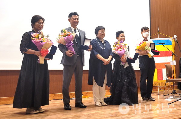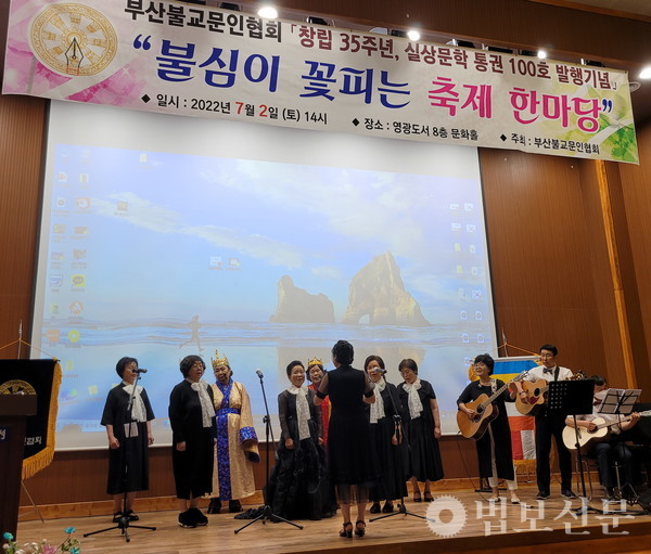 부산불교문인협회(회장 차정연)는 7월2일 부산 영광도서 8층 문화홀에서 ‘창립 35주년·실상문학 통권 100호 발행기념 – 불심이 꽃피는 축제 한마당’을 봉행했다. 이날 법석에는 부산불교문인협회 실상문학상 운영위원장 혜총 스님을 비롯한 대덕 스님들과 차정연 부산불교문인협회장 등 회원 문인들이 두루 참석해 협회의 35주년과 ‘실상문학’ 통권 100호의 발행을 축하했다. 특히 이 자리에서는 협회 발전에 공헌한 회원에게 공로상, ‘실상문학’을 통해 등단한 회원에게 신인상을 전달하며 활동을 격려했다. 또 회원들이 직접 시낭송, 민요, 우크렐라 연주, 무용, 합창 등을 선보이며 문학과 어우러진 공연의 장도 펼쳐 환희심을 더했다.