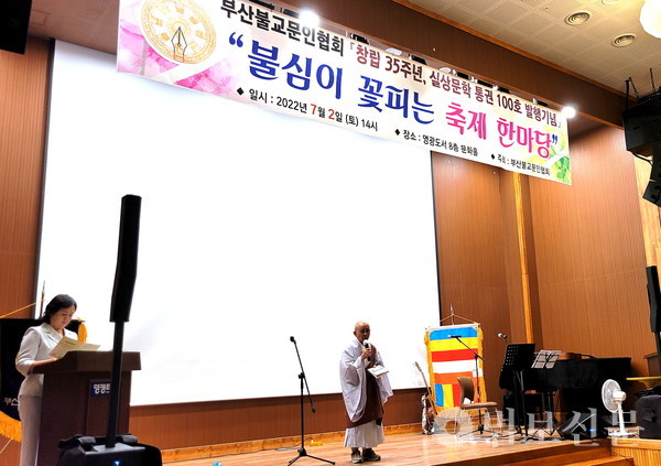 부산불교문인협회가 창립 35주년과 ‘실상문학’ 통권 100호 발행을 기념해 회원들의 화합과 협회의 저변 확장을 기원하는 축제의 법석을 개최했다.