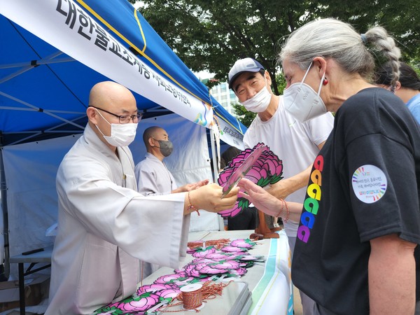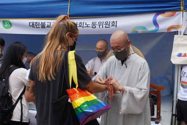 7월16일 퀴어문화축제 조계종 사회노동위원회 부스를 방문한 이들이 바라본 불교의 모습이다. 조계종 사회노동위원회(위원장 지몽 스님)는 이날 서울 시청광장에서 열린 ‘살자 함께하자 나아가자 제23회 퀴어문화축제’에서 부스를 설치하고 성소수자도 함께 살아가는 평등세상을 발원했다. 부스 진행은 사회노동위원장 지몽 스님과 위원 시경·혜도·해륜·고금·동신·대각 스님 등이 함께했다.