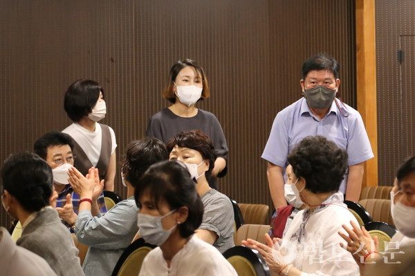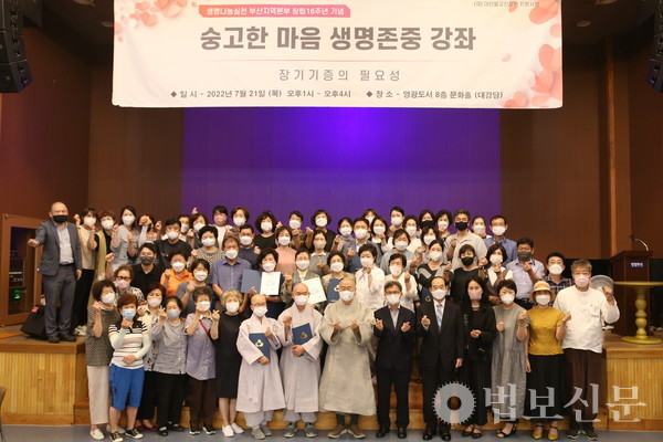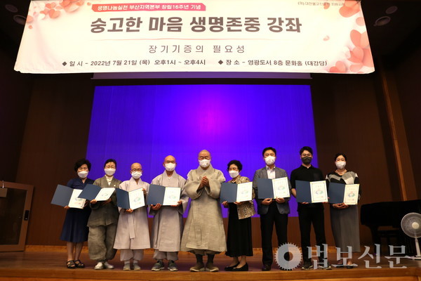 생명나눔실천 부산지역본부(본부장 심산 스님)는 7월21일 부산 영광도서 8층 문화홀에서 ‘숭고한 마음 생명존중 강좌’를 개최했다. ‘장기기증의 필요성’을 주제로 마련된 이번 강좌는 생명나눔실천 부산지역본부가 매년 창립 기념일을 전후로 부산시민을 위해 마련하는 특별 행사다. 특히 강좌는 재단법인 대한불교진흥원 지원사업으로도 선정돼 진행돼 의미를 더했다. 이날 강의에는 부산 홍법사, 대광명사, 원오사, 행복선원, 여래사 등 각 사찰 스님과 불자, 조계종 포교사단 부산지역단 생명나눔팀 포교사들과 생명나눔실천 경남지역본부 이사 및 사무국 임직원, 강의를 신청한 시민 등 100여 명이 동참했다.