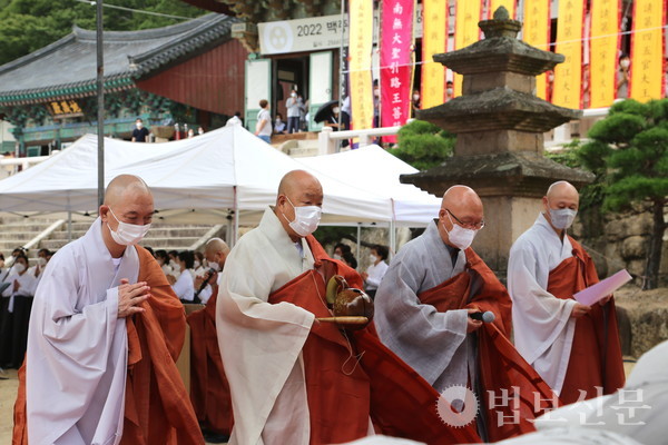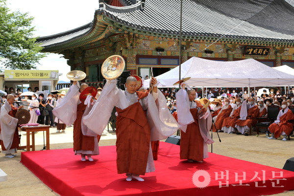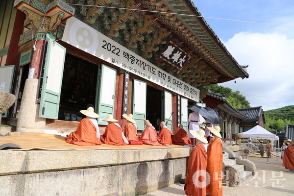 범어사(주지 보운 스님)는 8월15일 경내 일대에서 ‘불기 2566년 백중지장기도 선지식 초청법회 회향법회’를 봉행했다. 이날 법석은 금정총림 범어사 방장 지유 대종사의 증명아래 대웅전 영산회상도·신중탱·칠성탱 점안식으로 시작됐다. 이어 대웅전 앞마당에 괘불을 걸고 특설무대를 마련해 도량을 장엄한 가운데 사시불공이 봉행됐다.