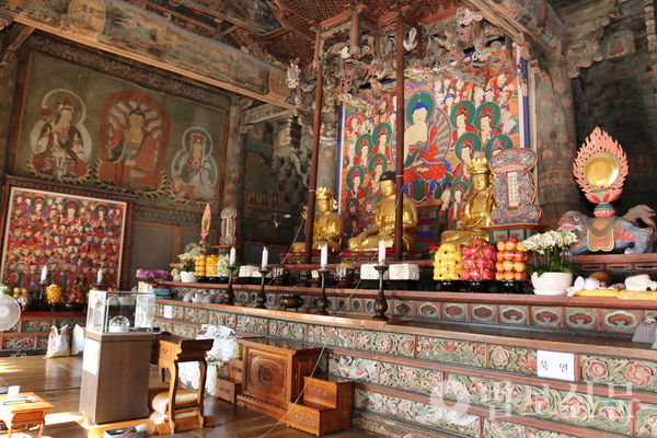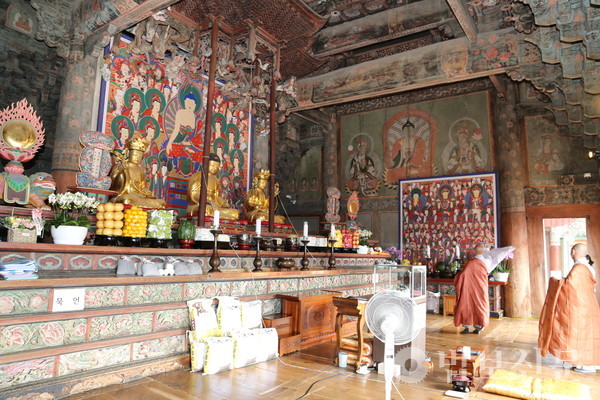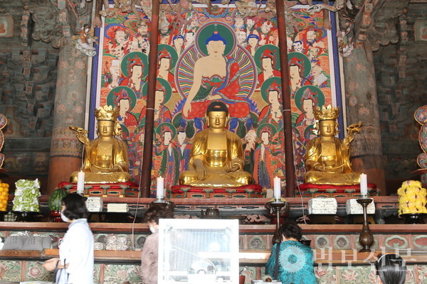 금정총림 범어사가 대웅전 상단 후불탱 영산회상도를 비롯해 세 점의 불화 모사본을 봉안하며 90일간 이어온 백중 지장기도 및 선지식 초청법회를 회향했다.