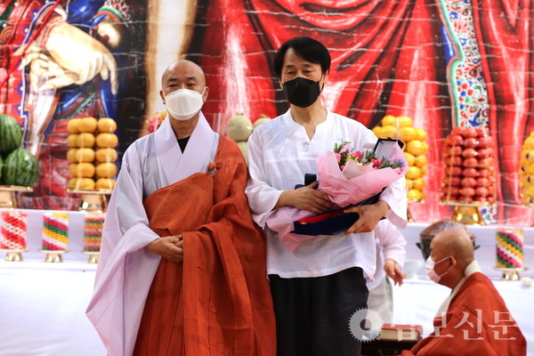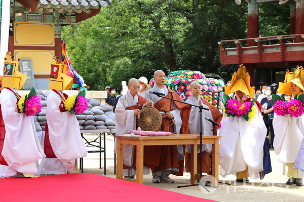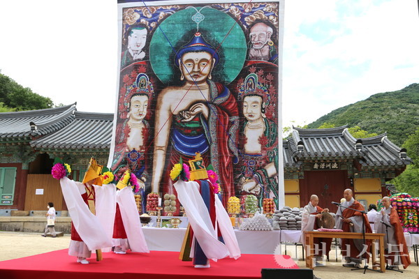 법요식에서는 지유 대종사가 백중 지장 기도 회향법문을 설했다. 신임주지를 맡은 보운 스님은 임명장을 받은 뒤 첫 공식 석상에서 인사말을 전했다. 대웅전 탱화 모사본 조성을 맡은 부산시 무형문화재 제15호 불화장 권영관 불모에게는 감사패가 전달됐다. 이후 관음시식이 진행됐으며 조계종 첫 비구니 어산어장 동희 스님을 비롯한 스님들이 영산재 특별 공연을 펼쳐 장엄함을 더했다.