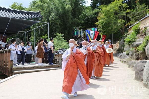 범어사 신임주지 보운 스님도 인사말에서 “올해는 백중 기도 회향과 함께 대웅전의 탱화 조성불사까지 완수되어 더욱 특별한 법석을 맞이하게 되었다”며 “지극한 신심과 효심으로 기도에 동참해 주신 불자 여러분의 원력이 모두 성취되길 축원 올린다”고 말했다. 이어 스님은 “범어사 스님들은 과거부터 내려온 소중한 불교 문화를 계승하고 후대에도 온전히 전승되도록 노력하고 있다”며 “여러분의 신심이 증장되고 훗날의 역사를 새겨나갈 활동에 더욱 최선을 다할 것”이라고 발원했다.