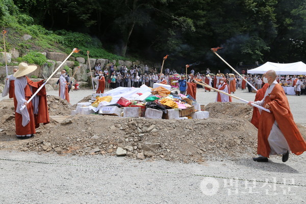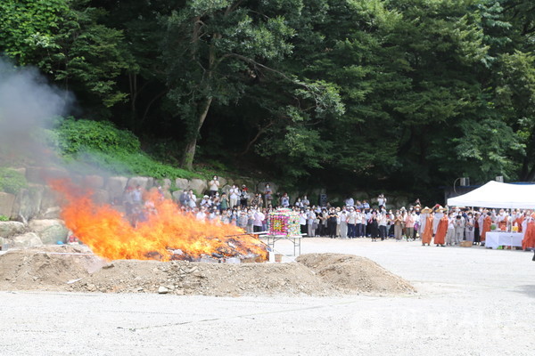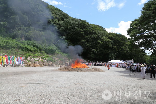 이날 영산재 공연이 끝난 뒤 스님들과 불자들은 소대로 이동했다. 이후 거화 외침과 함께 위패 소지의식과 염불로 법석이 회향됐다.