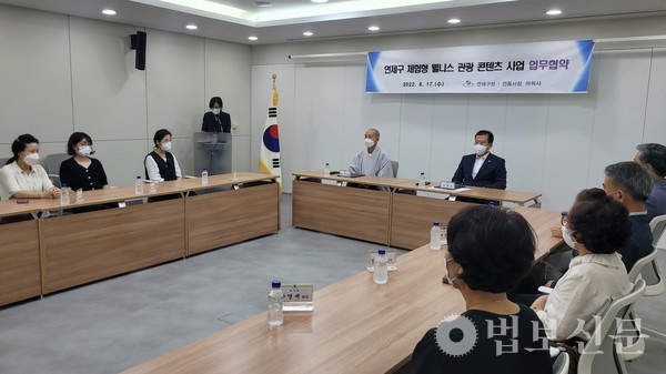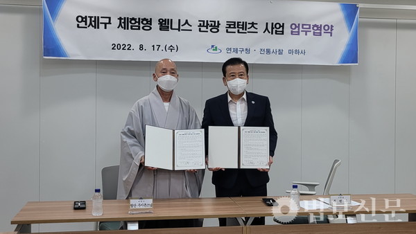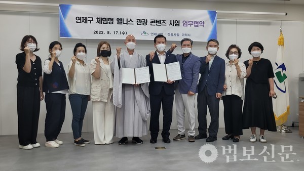 부산 마하사(주지 정산 스님)는 8월17일 연제구청에서 ‘연제구 체험형 웰니스 관광 콘텐츠 사업 업무협약식’을 가졌다. 이 자리에서 양 기관은 자연, 힐링, 명상 등을 통해 새롭게 시도하는 ‘웰니스 관광’ 프로그램 발굴과 진행에 있어서 적극적으로 협력할 것을 약속했다. 협약식에는 마하사 주지 정산 스님, 주석수 연제구청장, 김민지 마인드디자인 대표, 안정호 연제새마을금고 이사장, 김경희 나한회장, 박은희 목우회장, 안영제 지장회장, 김성남 관음회장, 문태근 거사림회장, 권오희 합창단 총무 등 신도회 간부들이 참석했다.