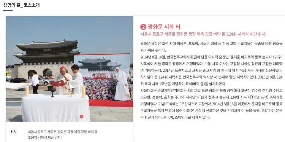 “프란치스코 교황의 집전으로 순교자 124명에 대한 시복식이 거행된 곳”이라는 설명이 영어·중국어·일본어로 안내된 이 간판에는 광화문광장 인근의 조선시대 유적지가 가톨릭 성지로 표기돼 있었다. 1396년 태조 이성계 지시로 세워진 조선 한양도성 남소문(南小門) ‘광희문’을 비롯해 조선시대 소문난 명천인 석정(石井) 보름우물, 의금부 터, 좌·우포도 청 터, 형조 터, 전옥서 터, 경기감영 터 등 24곳이 가톨릭 순례길에 포함됐다.