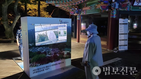 통도사 미디어아트 ‘화엄 세계로의 초대’는 디지털 미디어 맵핑, 인터랙티브, 홀로그램, VR 등을 접목해 △디지털 미디어아트 맵핑 △빛 오브제 △디지털 민화 특별전 등 총 3개 분야에서 11개의 콘텐츠로 전개됐다. 통도사 산문을 지나 무풍한송로에 들어서면 가장 먼저 만나게 되는 빛 오브제 프로그램은 중중무진 화엄세계에 드는 출발점을 알렸다. 화엄의 진리가 담긴 ‘법성게’ 구절을 빛으로 전달하며 미러 오브제, 라이팅 오브제, 인터랙티브 터널, VR월·ASMR월 등을 통해 각양각색의 볼거리와 더불어 양산시의 가치도 다채롭게 소개해 눈길을 끌었다.