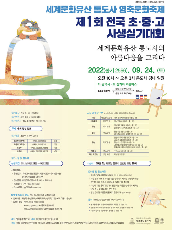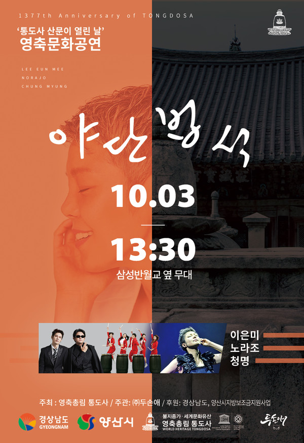 통도사의 개산 1377주년 개산대재는 ‘미디어아트 - 화엄세계로의 초대’를 비롯해 9월3일부터 10월10일까지 경내 일대에서 다채로운 행사로 전개된다. 10월3일에는 영축삼보 이운(오전9시30분), 괘불헌공(오전10시), 이은미, 노라조, 청명 등이 출연하는 영축문화공연 ‘야단법석’(오후1시30분)이 개최된다. 10월4일에는 자장율사 영고재 및 개산대재 법요식(오전10시30분), 부도헌다례(오후2시) 등이 봉행된다. 이에 앞서 9월24일에는 오전10시부터 세계문화유산 통도사 영축문화축제 ‘제1회 전국 초·중·고 사생실기대회’가 열리며 이날 국기원태권도시범단의 특별공연도 마련된다.