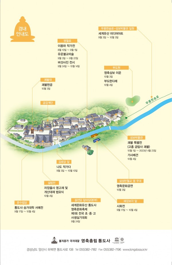 이밖에도 올해 처음 마련된 통도사 승가대학 서예전(10월4일까지), 개산대재 인기 코너인 ‘나도 작가다’ 스님들의 스마트폰 사진전(10월10일까지), 성보박물관 ‘고흥 금탑사 괘불’ 특별전(10월1일부터)과 가사 배견(10월4일 하루), 유운불교미술전(9월22일까지), 야생버섯 사진전(10월14일까지), 부산불교문인협회와 발달장애인이 함께하는 시화전(10월4일까지) 등 전시 행사도 다양하다. 경내 곳곳의 국화 장엄도 산사를 찾는 이들에게 법향을 전한다. 통도사 암자를 순례하며 쓰레기를 줍는 ‘산사 플로깅’은 9월25일부터 10월16일까지 매주 일요일 오전10시 반야암 주차장에서 시작된다.