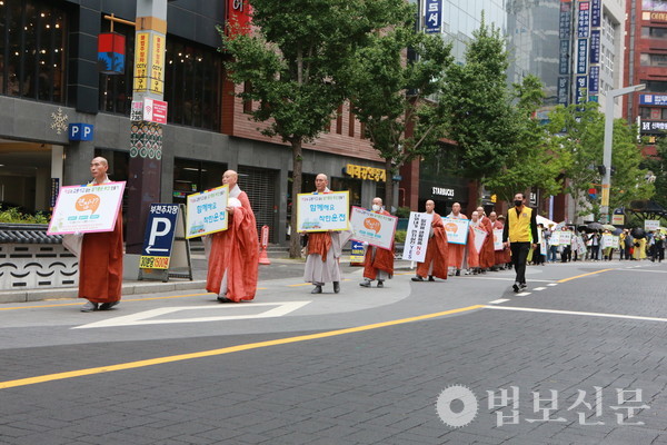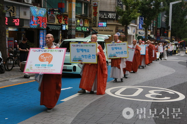 부산불교교육대학 출신 스님들의 봉사 모임 부산 화엄승가회와 부산불교교육대학이 함께 부산 시민의 교통 안전을 염원하는 거리 캠페인을 전개했다.