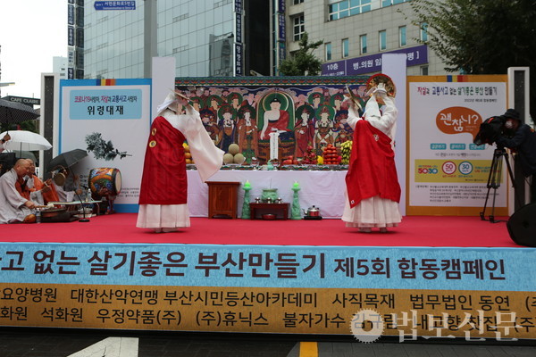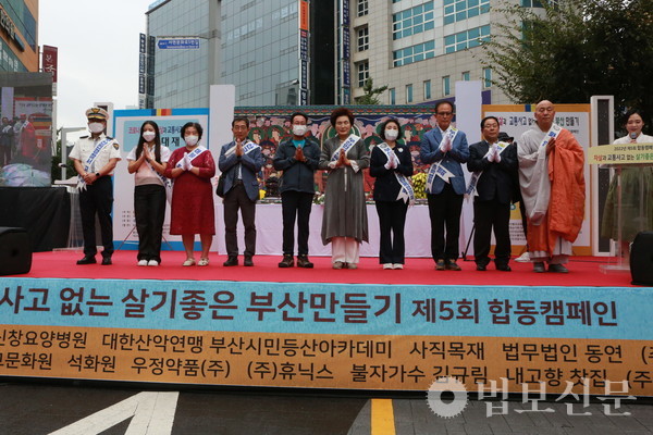 화엄승가회(회장 자인 스님)·부산불교교육대학(학장 범혜 스님)은 9월17일 부산 서면 영광도서 앞 광장에서 ‘자살과 교통사고 없는 살기좋은 부산 만들기 제5회 합동 캠페인’을 봉행했다. 법회는 조계종 삼보문화회가 주최하고 부산불교교육대학과 화엄승가회가 공동 주관, 부산시가 후원했다. 이 자리에는 창원 성주사 회주 흥교 대종사가 증명법사로 참석했으며 화엄승가회장 자인 스님을 비롯한 회원 스님들과 부산불교교육대학 학장 범혜 스님, 재학생 및 동문들이 참석했다. 법회는 제1부 순서로 코로나19 사망자와 자살, 교통사고 사망자 위령대재가 엄수됐다. 이어 제2부에서는 기념식이 마련됐으며 제3부에서 거리 캠페인이 전개됐다.