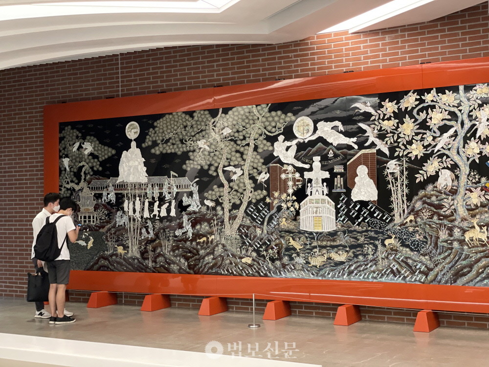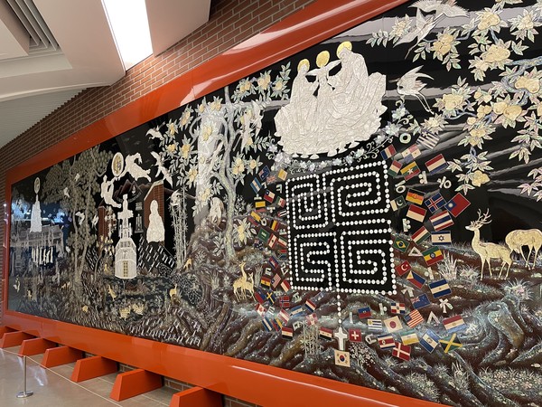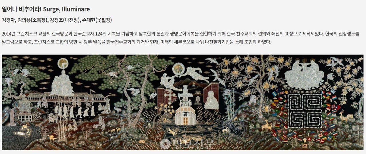 서소문성지 역사박물관은 제2상설전시실에 한 벽을 가득 채우는 초대형 나전칠화(960㎝×300㎝)를 걸어뒀다. ‘일어나 비추어라’는 제목의 나전칠화는 순교정신을 담아 한국 가톨릭의 어제와 오늘, 내일을 형상화 것으로 안내되고 있다. 작품의 법계도는 작은 원들로 중간 중간에 여백을 줘 마치 가톨릭 묵주처럼 보이게 만들었다. 특히 법계도 끝에 십자가를 매달았으며 십자가 안으로는 예수로 추정되는 인물이 태극기 위에 군림해 서있는 듯 보이게 했다. 법계도 종착지에 십자가를 걸어둔 것이 논란이 될 수 있다고 판단했는지 2017년 바티칸 박물관 특별전 당시 십자가를 모호하게 표현했지만 서소문 칠화에서는 십자가가 선명해진 모양새다.