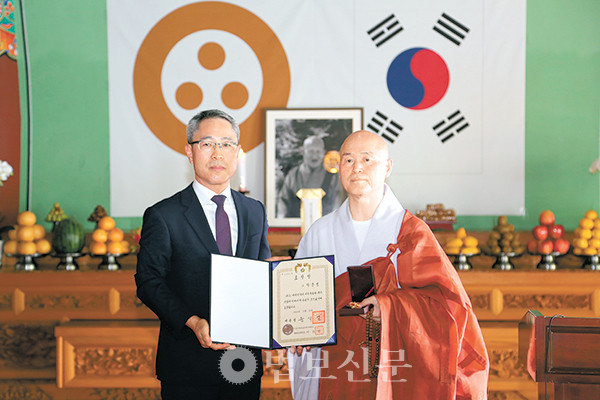 일제강점기 친일승려 척결과 조선총독부 사찰령 폐지에 앞장선 동고당 문성 대종사의 독립유공자 추서를 기념하는 포상 전수식이 부산 해인정사에서 마련됐다.