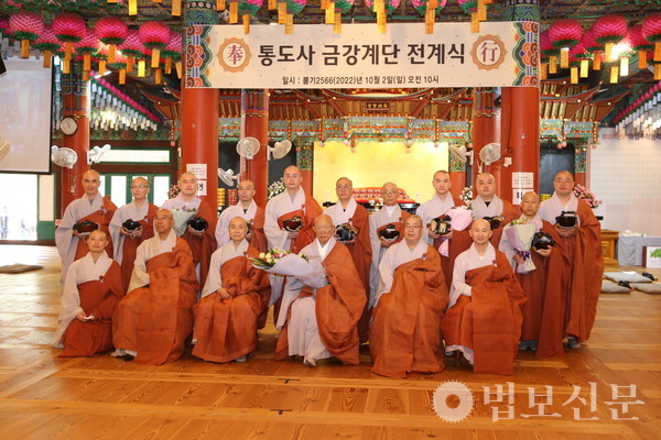 통도사(주지 현문 스님)는 10월2일 경내 설법전에서 ‘개산 1377년 기념 통도사 금강계단 자장율맥 전수법회 중산 혜남 율사 전계의식’을 봉행했다. 이날 법석은 영축총림 전계사 중산 혜남 스님이 자장율사로부터 이어져 온 해동남산율맥을 전하는 세 번째 의식으로 마련됐다. 법회는 고불문 낭독, 종정법어(대독), 전계 제자 소개, 계맥 설명, 전계제자 서원, 전계첩·의발 수여, 축사 등으로 진행됐다.