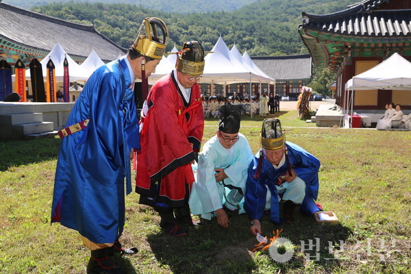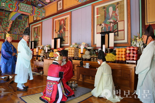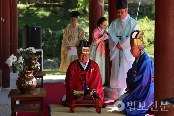 표충사(주지 진각 스님)는 10월1일 경내 표충서원에서 ‘제558회 표충사 사명대사 추계향사’를 봉행했다. 이 자리에는 전 통도사 주지 원산 대종사, 표충사 주지 진각 스님 등 대덕 스님들과 박일호 밀양시장, 정정규 밀양시의회 의장, 이원효 성균관유도회 밀양시지부 회장과 회원, 사명대사 문중 후손들과 밀양 시민, 불자 등이 참석했다. 향사는 명종으로 시작을 알렸으며 삼귀의례, 반야심경, 종사영반과 헌다, 헌향, 헌화 의식이 이어졌다. 이어 박일호 밀양시장이 초헌관을 맡은 가운데 유교식 제향인 석전의례를 올렸다. 추모사, 인사말, 사홍서원으로 마무리됐다.