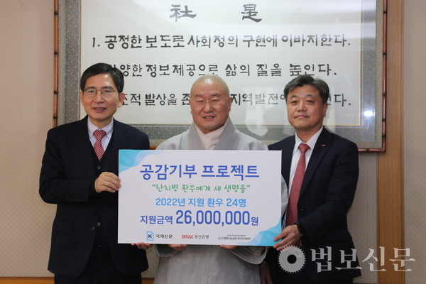 생명나눔실천 부산지역본부장 심산 스님은 “경제적으로 어려운 상황에 놓인 난치병 환우들에게 희망을 전할 수 있도록 적극적으로 협력해주신 국제신문과 BNK부산은행에 깊이 감사드린다”며 “앞으로도 환우들에게 희망을 주는 공동 캠페인이 지속적으로 이어져서 우리 사회에 희망의 등불을 밝힐 수 있길 바란다”고 취지를 전했다.