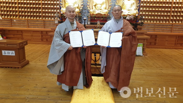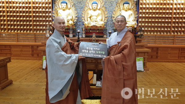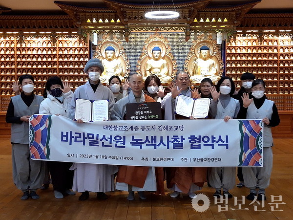 바라밀선원(주지 인해 스님)은 1월18일 경내 대웅전에서 ‘바라밀선원·부산불교환경연대 녹색사찰 업무협약식’을 개최했다. 이 자리에는 김해 바라밀선원 주지 인해, 부산불교환경연대 상임대표 안도 스님과 한주영 불교환경연대 사무총장, 바라밀선원 신도 등이 참석했다. 이날 부산불교환경연대는 녹색사찰 협약에 이어 ‘녹색사찰’ 현판을 바라밀선원에 전달하며 적극적인 활동을 기대했다. 협약식에 이어 바라밀선원 신도들을 대상으로 녹색사찰운동에 대한 설명회의 시간도 마련됐다.
