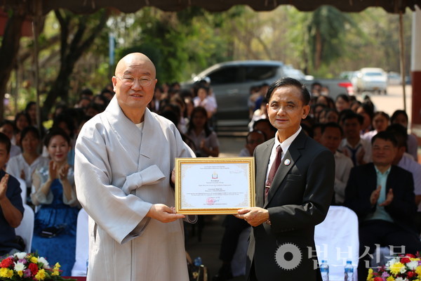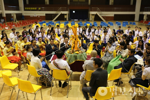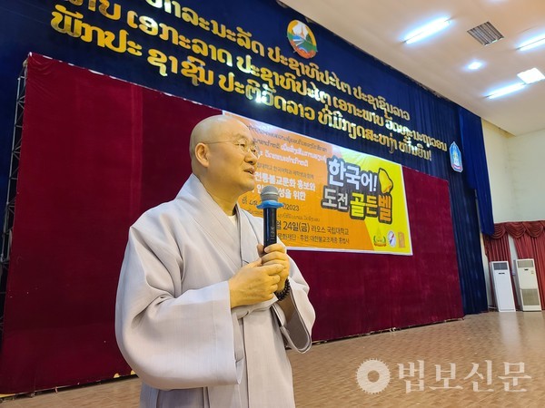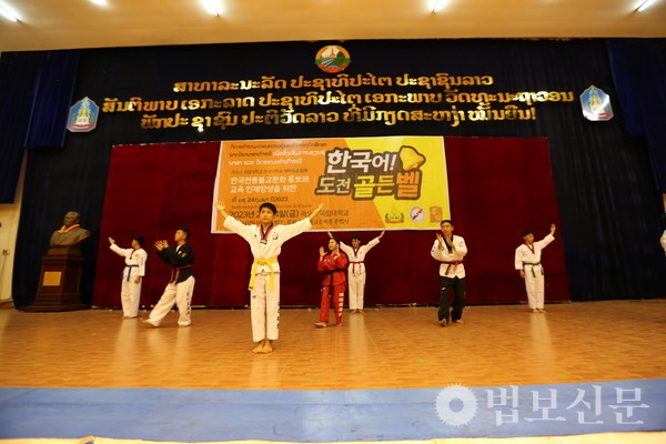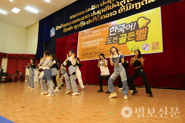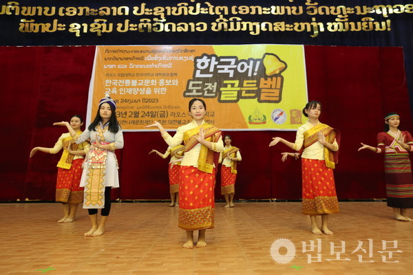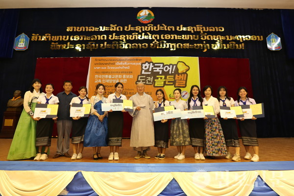 한나래문화재단(이사장 심산 스님)은 지난 2월24일 라오스국립대에서 ‘제1회 한국어 도전골든벨’을 개최했다. 라오스국립대 한국어학과 재학생 150여 명이 참석한 이날 행사에서는 재학생들이 직접 라오스 전통 공연, K-pop 공연을 선보였으며 방삐엥 소수 민족의 태권도 시범, 라오스 전통의 바시 의식 등이 이어져 열기를 더했다. 이날 한국어 도전골든벨 대상을 비롯한 수상자 3명과 지도교수 1명은 지난해 12월 라오스 수파누봉대에서 열린 제1회 한국어 도전골든벨 수상자 및 지도교수와 함께 부처님오신날 전후로 홍법사를 방문할 예정이다.
