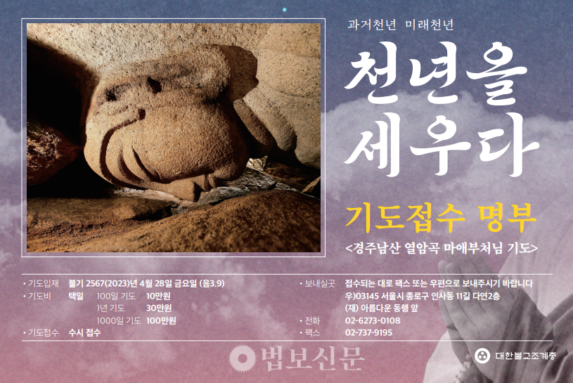 총무원장 진우 스님은 “전국사찰에 배포된 ‘기도접수명부’ 모연문을 통해 ‘열암곡 마애부처님을 바로 세우는 것은 나를 일으켜 세우는 것이며, 우리 모두의 본성을 회복하는 성스러운 불사다. 과거천년 미래천년 ’천년을 세우다‘ 기도동참으로 가정화목과 융성의 공덕 짓는 인연이 되길 바란다”고 많은 참여를 독려했다.