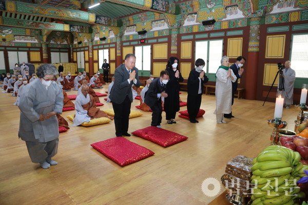 범어사(주지 보운 스님)는 3월21일 경내 보제루에서 ‘불기 2567년 개산중흥조 다례재’를 봉행했다. 이날 법석에는 금정총림 범어사 주지 보운, 승가대학장 정한, 율원장 원창 스님을 비롯한 사중 스님, 신도 대표단 등이 참석했다. 상단불공에 이어진 의식은 명종5타, 죽비 삼배, 헌향 및 헌다, 반야심경 봉독, 입정, 헌화 등으로 진행됐다.