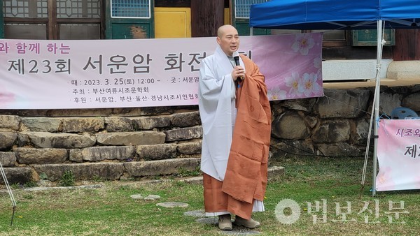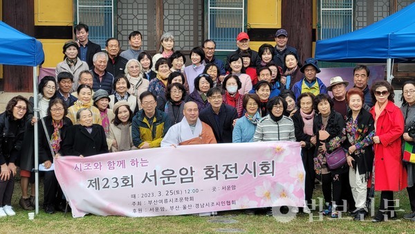 통도사 서운암(감원 서송 스님)은 3월25일 경내 무위선원 앞뜰에서 ‘제23회 서운암 화전시회(花煎詩會)를 개최했다. 이 행사는 부산여류시조문학회가 주최하고 서운암과 부산·울산경남시조시인협회가 후원하는 가운데 시조시인들이 모여 화전놀이를 계승하고 발전하는 장으로 마련됐다. 행사는 1부 시조 낭송과 화전 부치기, 화전을 통한 시조 창작, 2부 완성품 제출 및 시상 등으로 진행됐다.