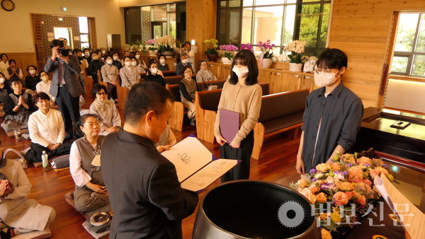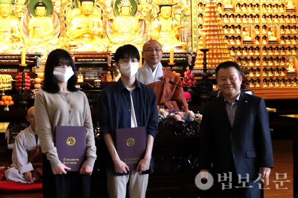 동림선원(주지 신공 스님)은 4월22일 경내 3층 대법당에서 ‘동림선원 개원 5주년 기념법회’를 봉행했다. 특히 이날 동림선원은 개원 5주년을 기념해 법석에서 ‘은암문화재단 은암장학회 장학금 전달식’을 봉행했다. 지난해에 이어 두 번째로 마련된 이날 전달식에서는 박고경(인제대 식품영양·식품공학부 4), 박형준(부경대 전기공학과 3) 학생이 각각 장학금을 받았다. 이번 장학생들은 지난 3월2일부터 4월7일까지 은암문화재단 홈페이지와 김해시청에 공지, 4월7일까지 접수된 신청서를 취합해 최종 선정됐다.