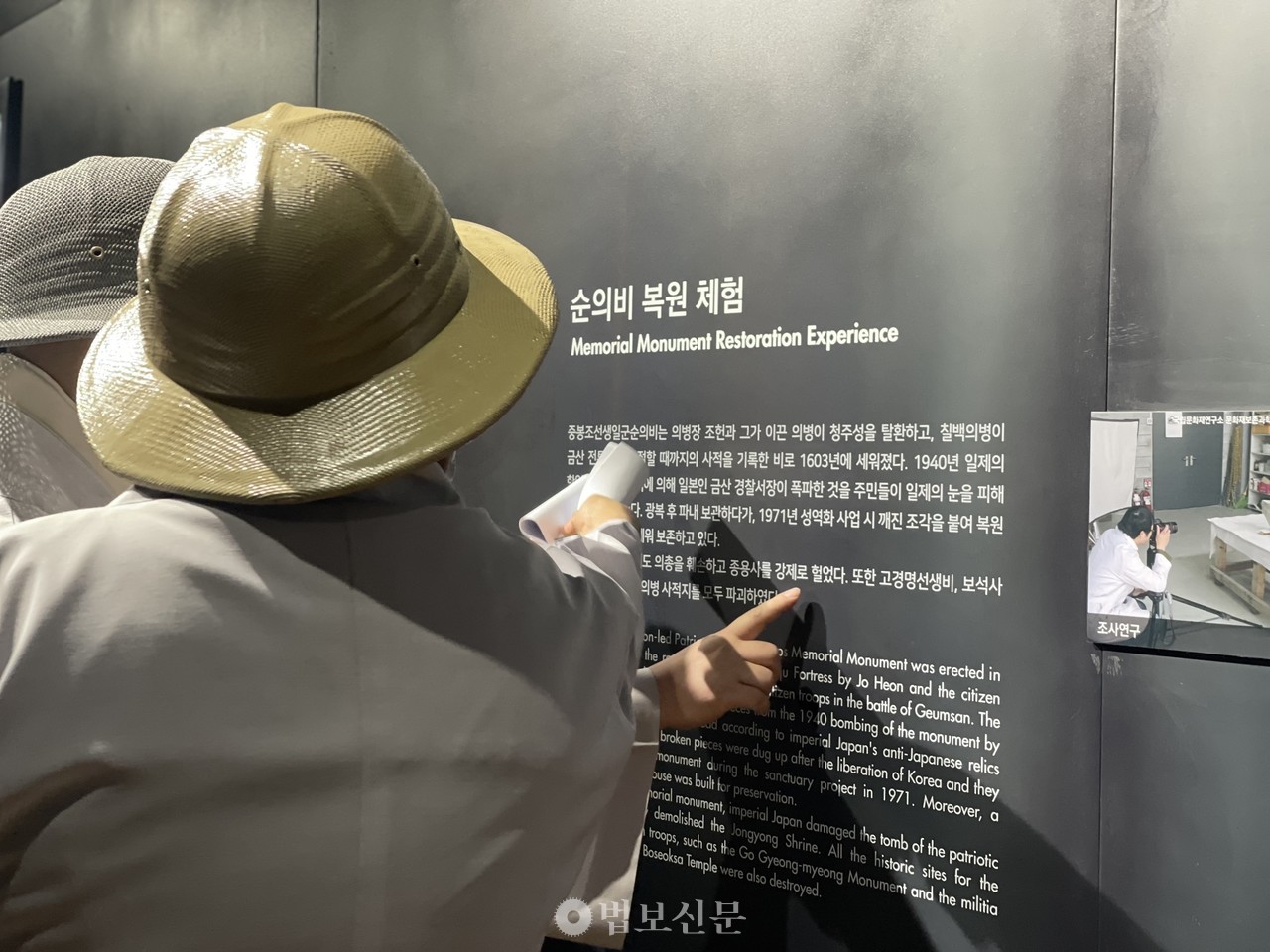 칠백의총기념관으로 걸음을 옮긴 스님들은 기념관의 전시 유물과 설명문을 하나하나 꼼꼼히 읽고 살폈다. 칠백의총기념관은 금산전투를 이끈 이름 모를 의인들의 정신을 계승하고자 문화재청이 2019년 설립했지만, 정작 의승의 기록은 누락돼 비판을 받고 있다. 특히 제1전시실에는 영규대사가 마치 조헌이 이끈 700의병에 포함된 듯 서술해 인상을 찌푸리게 했다.