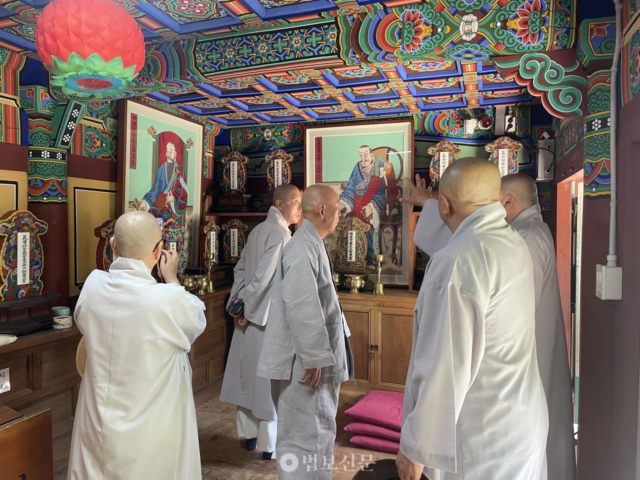 도량에 들어서자 주지 장곡 스님이 특위 스님들을 환영했다. 장곡 스님은 특위 스님들을 조사전으로 안내했다. 임진왜란 당시 구국을 위해 앞장섰던 서산, 사명, 영규대사 진영뿐 아니라 지난해 11월 새롭게 봉안한 금산 전투 의승 신문·공연·운우·도신·홍선·각해·홍월·인진·지한·운담·지원·최호·처영·운일 스님의 위패가 모셔져 있었다. 장곡 스님의 오랜 노력으로 발굴된 의승들 위패다.