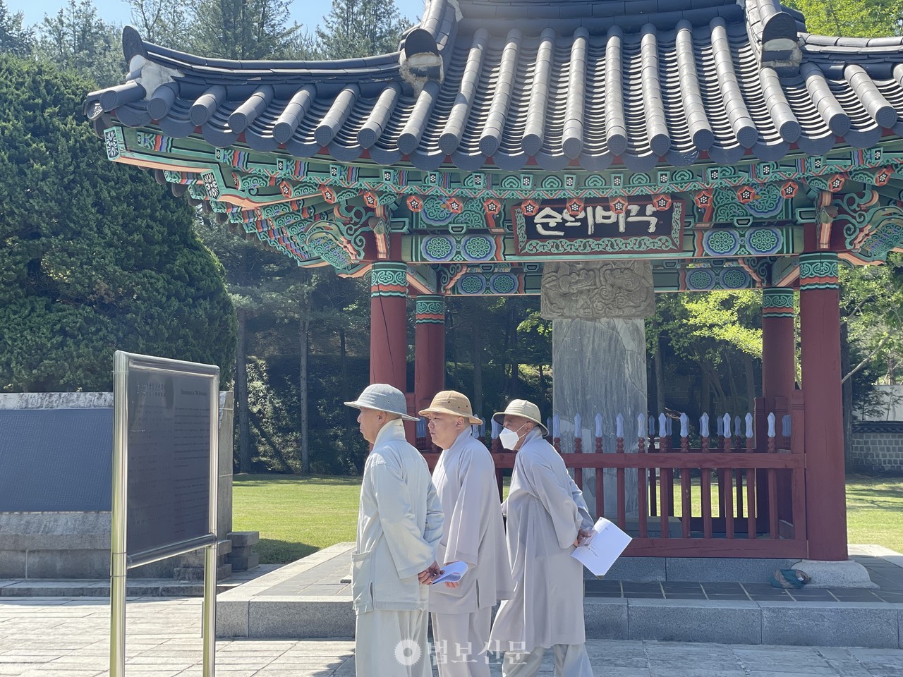 스님들은 사적 입구인 의총문(취의문) 인근의 ‘중봉조선생일군순의비’부터 살펴봤다. 조선 선조36년(1603) 세워진 이 비에는 조헌 선생과 영규 대사가 이끈 1500여 의사가 청주성을 수복하고 금산싸움에서 순절하기까지의 사적이 새겨져 있다. 비석은 애초 의총 옆에 건립됐다. 하지만 1940년 일제강점기 항일유적말살정책으로 파손됐다. 그러다 1971년 복원돼 현 위치로 옮겨졌다. 순의비 안내판에 의승에 관한 설명은 없었다. 영규대사는 조헌 선생의 조력자로 표현돼 있었다.