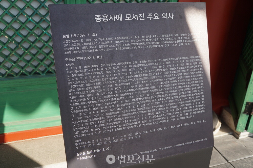 사당 앞으로는 ‘종용사에 모셔진 주요 의사’라는 안내판이 있었다. 비교적 최근 세워진 듯 보였다. 1592년 8월18일 연곤평 전투(제2차 금산전투) 의사를 적어둔 명단에 13명의 의승 법명이 적혀 있었다. 하지만 이마저도 의병 수에 비해선 터무니 없이 적었다.