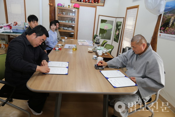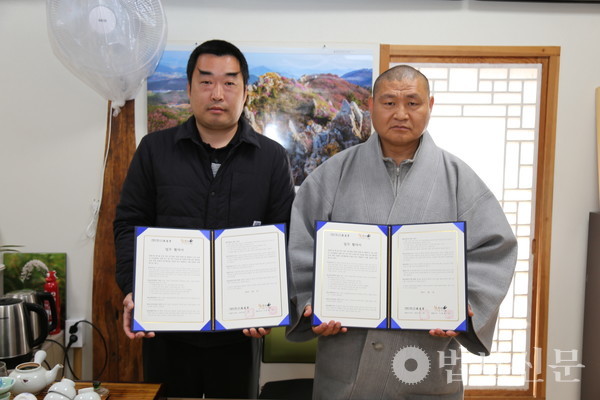 표충사(주지 진각 스님)는 4월5일 경내에서 ‘표충사 비단벌레 생태 연구 및 지속 가능한 종 보존을 위한 상호 업무협약식’을 마련했다. 이 자리에서 표충사 주지 진각 스님과 이용화 주식회사 숲속의작은친구들 대표이사는 업무협약을 통해 천연기념물 제496호이며 멸종위기 1급 곤충인 비단벌레(Chrysochroa coreana)의 곤충 생태 연구와 증식 및 복원을 위해 협력하기로 뜻을 모았다.