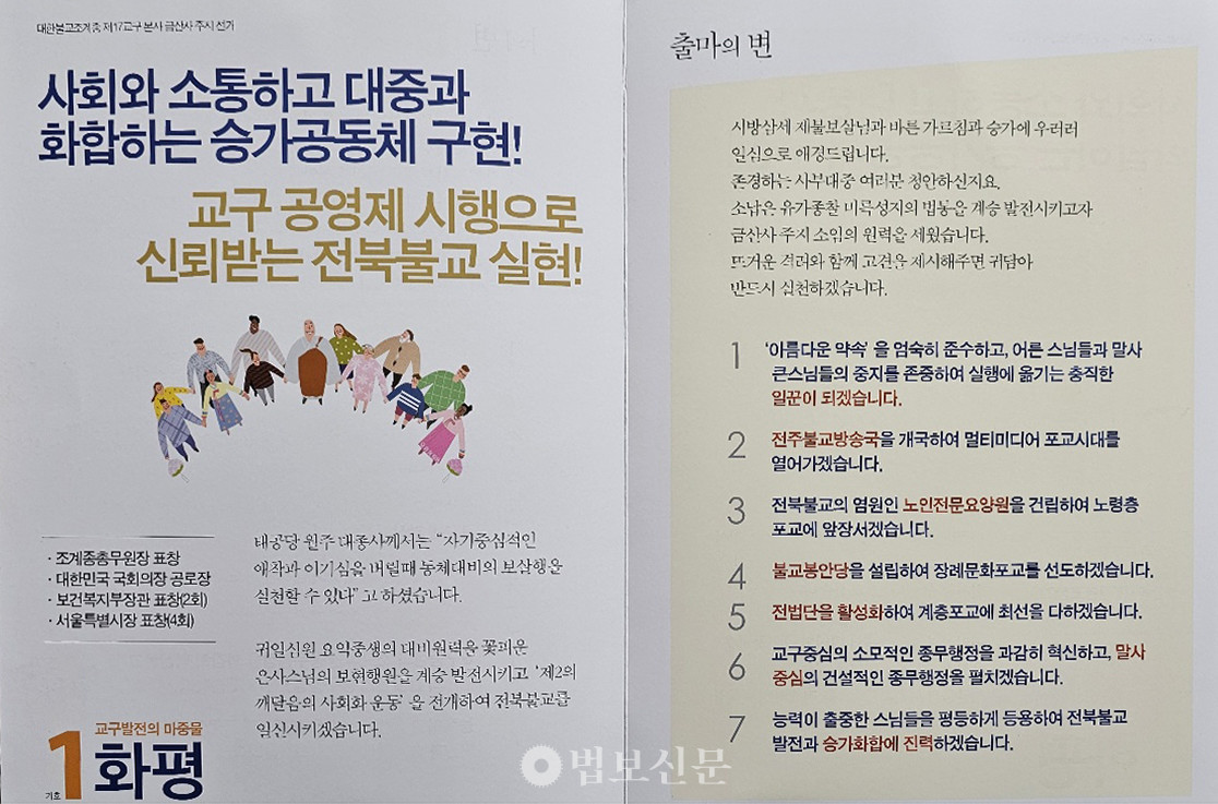화평 스님이 발표한 공약 가운데 눈길을 끄는 키워드는 ‘포교’와 ‘행정’이다. 화평 스님은 특히 멀티미디어 포교 시대의 중요성을 강조하며 '전주불교방송국 개국'을 핵심 공약으로 내걸었다. 또 △노령층 포교를 위한 노인전문요양원 건립 △장례문화 포교를 위한 불교봉안당 설립 △계층 포교를 위한 전법단 활성화 등 '포교'를 내걸었다. 특히 말사 중심의 종무 행정의 필요성을 역설하면서 "더이상 교구중심의 소모적인 종무행정은 안된다. 과감히 혁신해 말사 중심의 건설적인 종무행정을 펼칠 것"이라고 설명했다. 이외에도 전북불교 발전과 승가화합을 위한 평등한 '등용 시스템'을 마련하겠다는 계획이다.