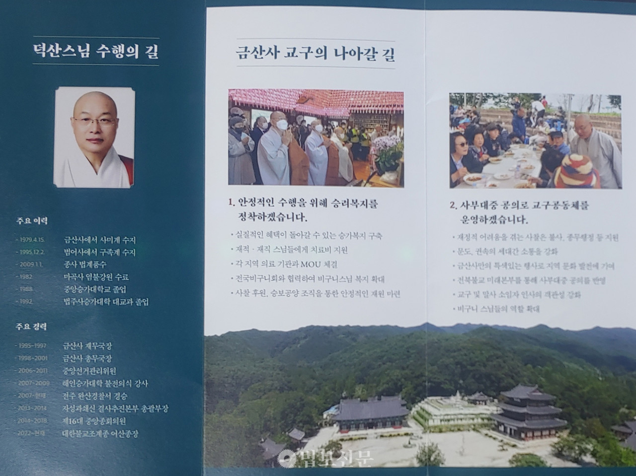 김제 금산사 차기주지 선거에 출마한 현 주지 일원 스님이 4월 26일 후보직에서 사퇴했다. 이에 따라 선거는 화평, 덕산 스님의 양자 대결로 압축됐다. 두 스님은 4월 30일 열릴 산중총회 막판까지 각자의 공약을 내세우며 열띤 선거 운동을 벌일 것으로 보인다.