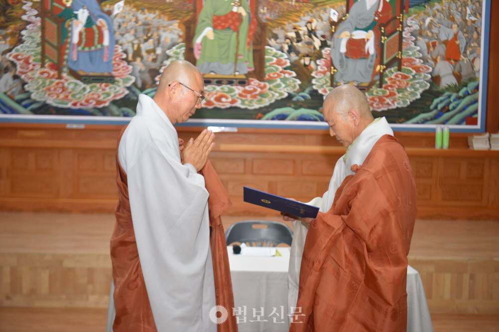 이날 의장 일원 스님은 "산중총회법에 의거 화평 스님 등 3명의 후보가 출마하였으나 일원 스님과 덕산 스님 2명이 사퇴해 단일 후보로 출마했다"며 "산중총회법 제12조1항에 의하여 화평 스님이 만장일치로 선출되었다"고 선포했다. 이에 중앙선거관리위원 혜민 스님은 위원장 태성 스님을 대신에 주지후보 당선증을 전달했다.