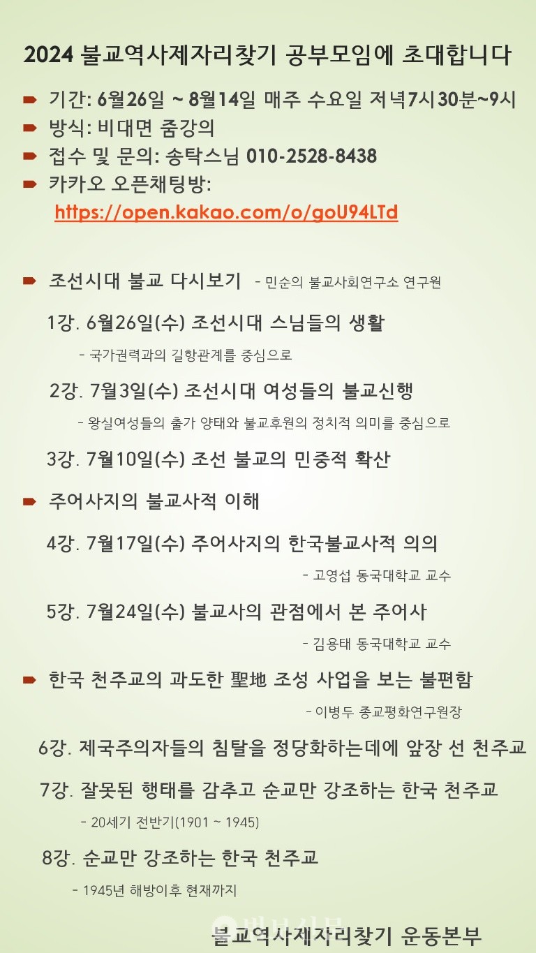 불교역사제자리찾기운동본부(본부장 송탁 스님)는 6월 26일~8월 14일 매주 수요일 저녁 7시 30분부터 1시간 30분간 화상회의 줌(ZOOM)으로 8차례 공부 모임을 진행한다. 주제는 크게 ‘조선시대 불교 다시보기’ ‘주어사지의 불교사적 이해’ ‘한국 천주교의 과도한 성지 조성 사업을 보는 불편함’으로 나뉜다.