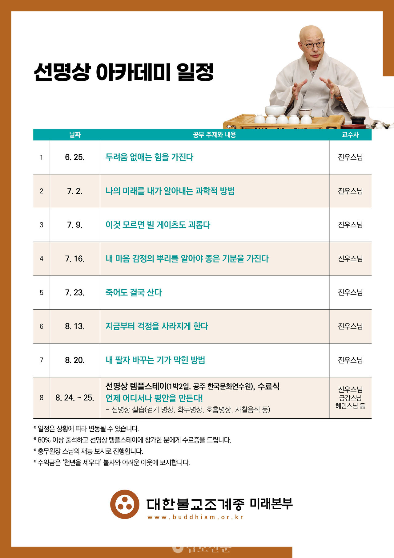 강의 주제도 진우 스님이 직접 선정했다. 1주차 ‘두려움 없애는 힘을 가진다’(6월25일), 2주차 ‘나의 미래를 내가 알아내는 과학적 방법’(7월 2일), 3주차 ‘이것 모르면 빌 게이츠도 괴롭다’(7월 9일), 4주차 ‘내 마음 감정의 뿌리를 알아야 좋은 기분을 가진다’(7월 16일), 5주차 ‘죽어도 결국 산다’(7월 23일), 6주차 ‘지금부터 걱정을 사라지게 한다’(8월 13일), 7주차 ‘내 팔자 바꾸는 기가 막힌 방법’(8월 20일)으로 진행된다. 8월 24~25일에는 공주 한국문화연수원에서 선명상(걷기·화두·호흡) 실습 템플스테이를 진행, 강의를 마무리한다.