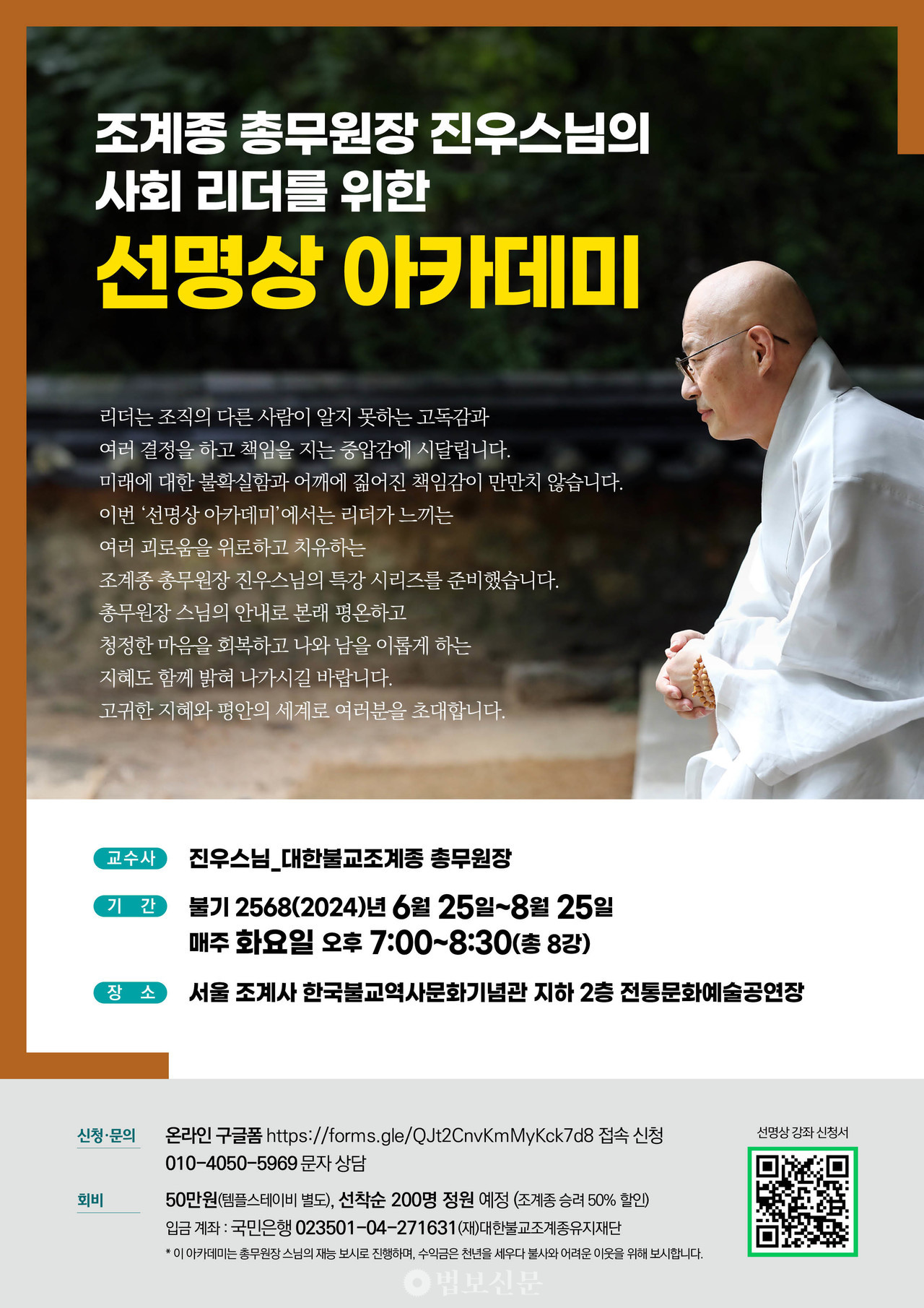 한국불교 전통 수행법인 간화선에 기반한 선명상 프로그램을 통해 국민 정신건강 문제 해결을 주도해나갈 것을 강조해온 조계종 총무원장 진우 스님이 사회 리더를 대상으로 선명상 아카데미를 마련, 직접 강의에 나선다. 이번 아카데미는 진우 스님이 정립 중인 명상법을 9월 예정된 국제선명상대회에 앞서 들여다볼 수 있다는 점에서도 주목된다.