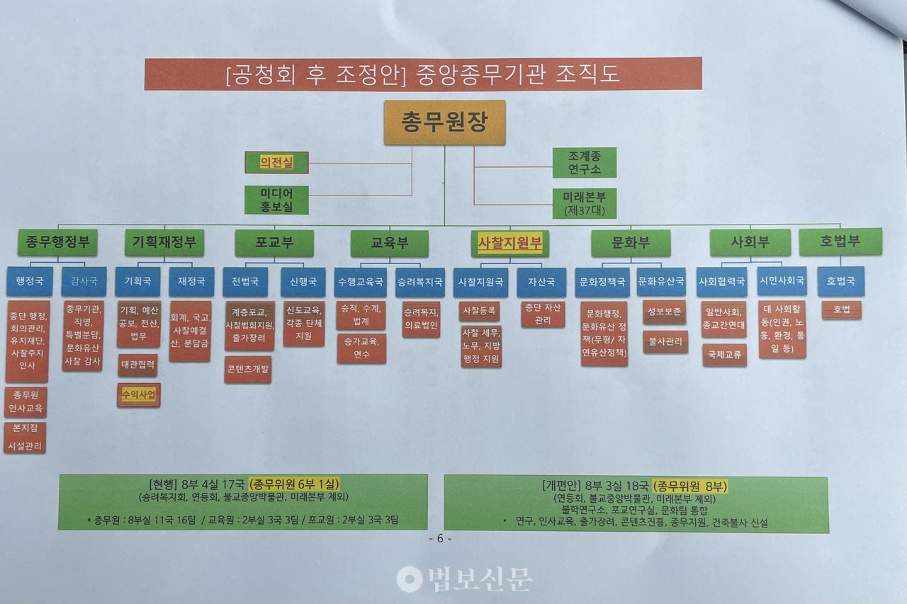 기획실장 우봉 스님은 지난 7월 17일 열린 공청회에서 나온 의견을 5가지로 정리했다. 이중 집행부가 반영한 조정안을 공유했다. 주로 부서간 업무 조정에 관한 내용이다. 첫째 ‘사찰부’의 수익사업 업무를 ‘기획재정부’로 이동한다. 둘째 ‘사찰부’의 사찰행정 업무를 ‘종무행정부’로 이동하고, 자산업무를 ‘기획재정부’로 이관한다. 사찰부는 폐지한다. 셋째 ‘문화부’의 불사관리 업무를 ‘종무행정부’로 이동한다. 넷째 ‘포교부’의 콘텐츠 개발 업무를 ‘문화부’로 이동한다. 다섯째 ‘기획재정부’의 공보 업무와 총무원장 직속 ‘미디어홍보실’ 업무를 통합한다.