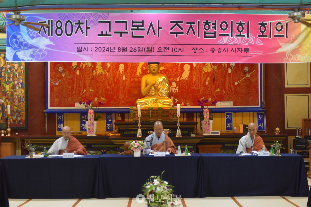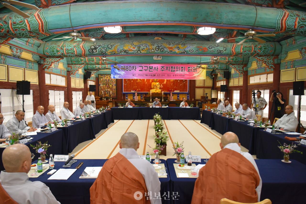 조계종 교구본사주지협의회(회장 허운 스님, 제주 관음사 주지)가 8월 26일 순천 송광사 사자루에서 제80차 회의를 개최하고 총무원으로부터 △불교도 대법회 봉행의 건 △총무원법 전부개정안 건 등을 보고 받았다.