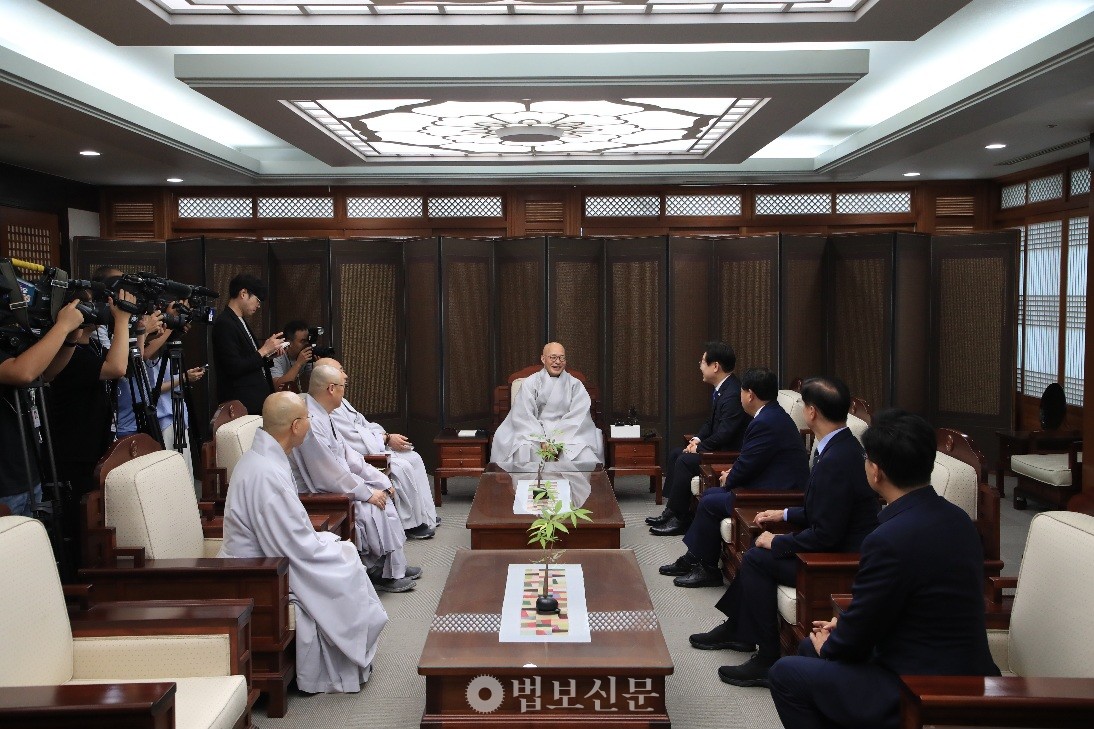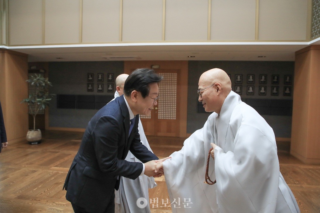 이후 비공개로 전환된 예방에서 총무원장 진우 스님과 이재명 대표 등 민주당 관계자들은 국정 현안에 대한 이야기를 나눈 것으로 전해졌다.