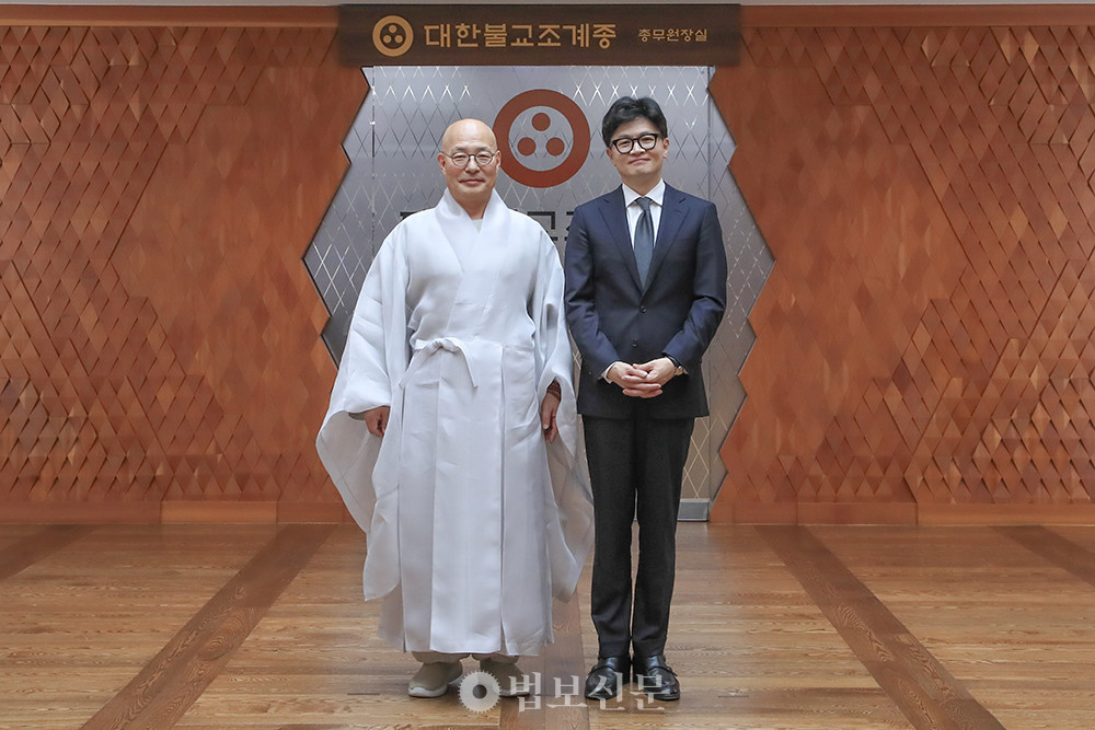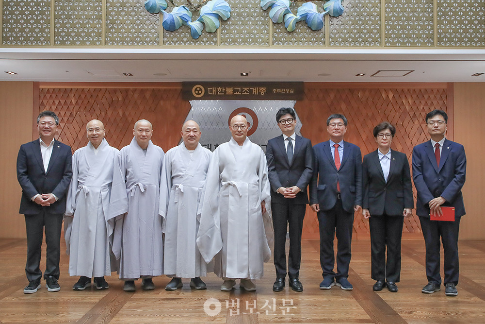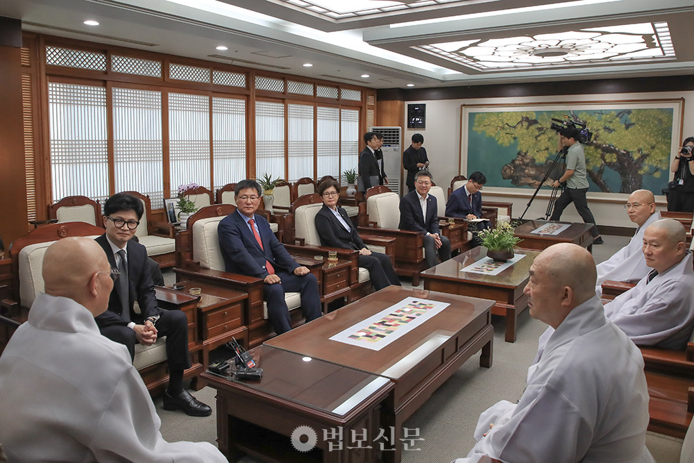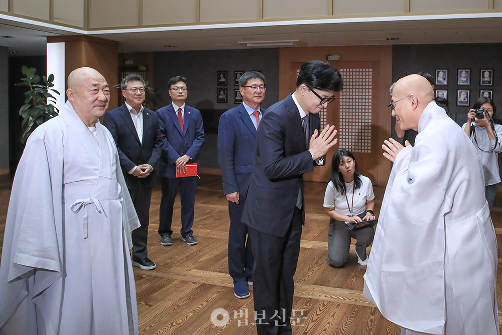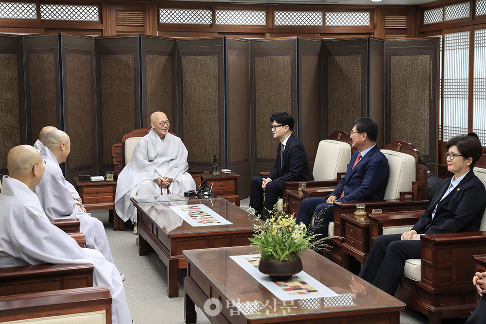 조계종 총무원장 진우 스님이 9월 19일 한국불교역사문화기념관 4층 접견실에서 한동훈 국민의힘 대표의 예방을 받고 “국민을 위해 절실한 마음으로 정치를 펴야 한다”고 당부했다. 이날 만남에는 총무부장 성화 스님, 기획실장 우봉 스님, 이헌승 국회 정각회장, 강선영 의원, 박정하 의원 등이 배석했다.
